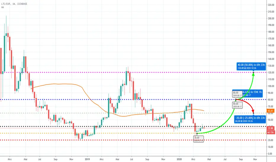 die zu erwartende Seitwärtsbewegung setzt sich wie prognostiziert fort. In Kombination mit dem BTCEUR Halving sehe ich den LTCEUR spätestens zu August an der 80€-Marke kratzen, mit Potenzial für mehr. Die Gründe dafür: