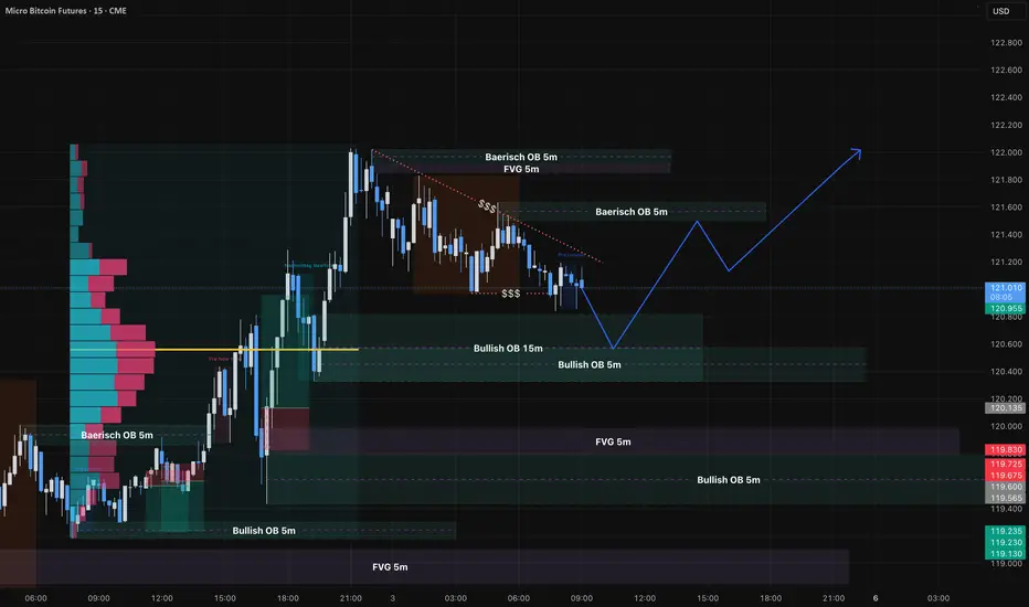 Break & Hold über dem bärischen OB (5m) → Ziel: weitere Ineffizienzen und höhere Hochs (siehe Projektion im Chart).