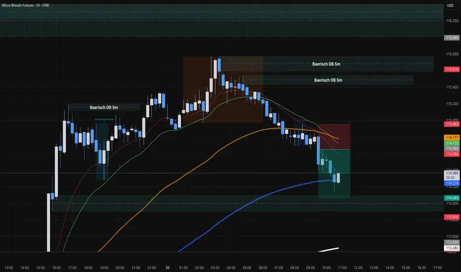 📌 Auf dem 15M-Chart sieht man die gleiche Struktur – die übergeordneten baerischen OBs halten den Preis aktuell weiter unter Druck.