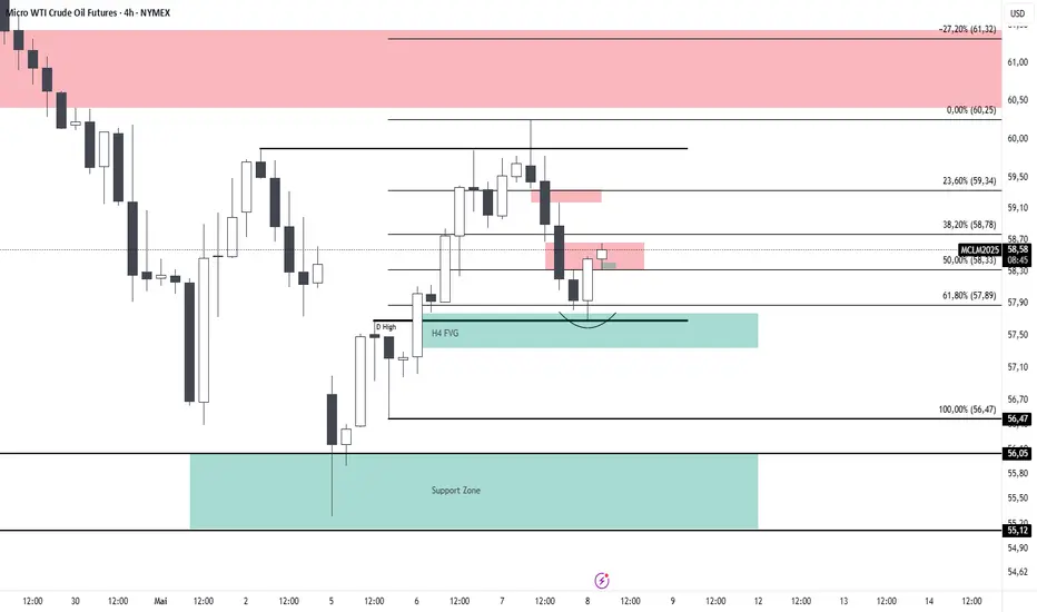 Am 05. Mai hat der der WTI Öl Preis die Tiefs vom April 2025 erfolgreich getestet. Daraufhin ist der Preis von ~55$ auf ~60$ angestiegen. Gestern (07.05.2025) kam es dann zu einer Korrektur, die für meinen Geschmack kaufenswert ist. Wir sehen, dass im H4 das bullishe FVG angelaufen ist. Dieses fällt mit einem Daily High und dem 61.80% Fib. Retracement zusammen. Exakt in diesem Preisbereich kamen die Käufer in den Markt und haben die Preis bereits über den Nachthandel im Micro Future nach oben getrieben.