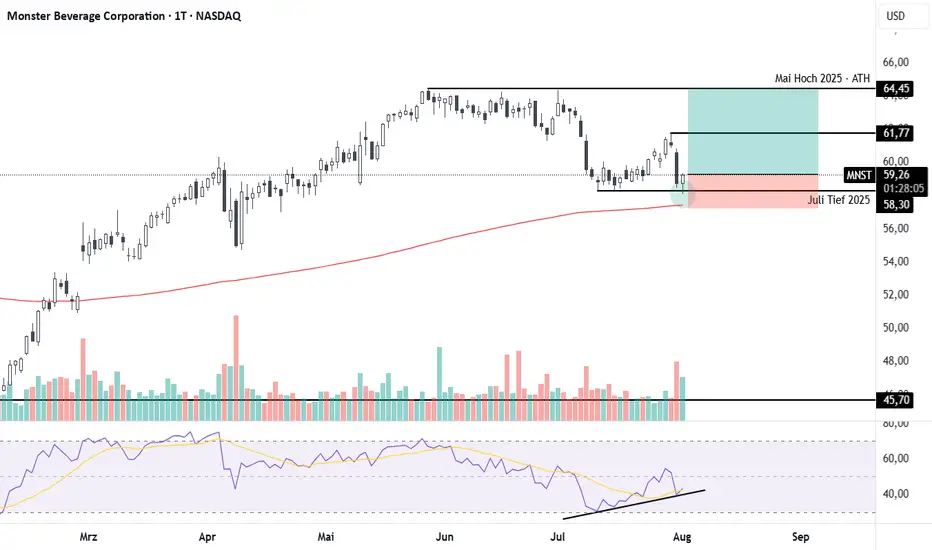 Entgegen des schwachen Gesamtmarkts kann sich die Aktie von Monster Beverage heute behaupten. Das Vormonatstief wurde gesweept und die Stopps liquidiert. Wir sehen eine klassische Umkehrkerze. Der Preis notiert nach wie vor über der 200-Tagelinie, was für einen Aufwärtstrend spricht. Im Volumen sehen wir einen deutlichen Anstieg - Käufer kommen in den Markt. Und im RSI sehen wir eine bullishe Divergenz. Während der Preis tiefere Tiefs bildet steigen die Tiefs im RSI an - der kurzfristige Abwärtstrend schwächt sich ab. Das Chancen-Risiko Verhältnis ist hier äußerst attraktiv. Unter die 200 Tagelinie sollte der Preis nicht mehr fallen. Ein erneuter Anstieg in Richtung Allzeithoch, das im Mai 2025 gebildet wurde scheint realistisch. Dadurch ergibt sich ein CRV von ~2,5