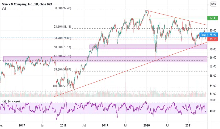 Enge Stopps könnten im Bereich bei 70-72 USD liegen oder etwas konservativer im Bereich 63-66 USD wo auch das 23.6er Fibonacci aus dem Jahre 2009 liegt. Die untere rote Linie ist ein Trendkanal aus dem Jahre 2009.