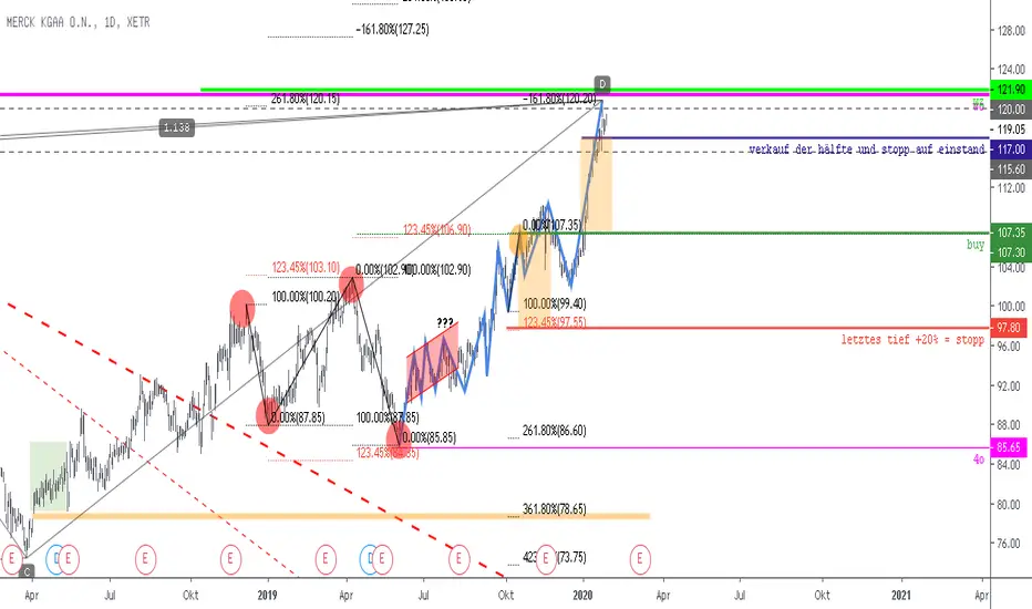 Jetzt gehts ans Eingemachte und um den eigentlichen Kauf. Am 19.9.19 wurde das Hoch vom April 2019 herausgenommen, wo man hätte eigtl. schon kaufen können. Aber der Kurs ging noch nicht über die 120% hinaus. Also Obacht. Besser ist der Kauf einen Monat später durch das Überschreiten der 120% Linie von April zu Mai 2019. Der Stopp dafür, 120% vom Einkauf zum letzten Tief. Verkauf der Hälfte der Position zum Gegenteiligen dem des Stopps (orangene Kästchen).