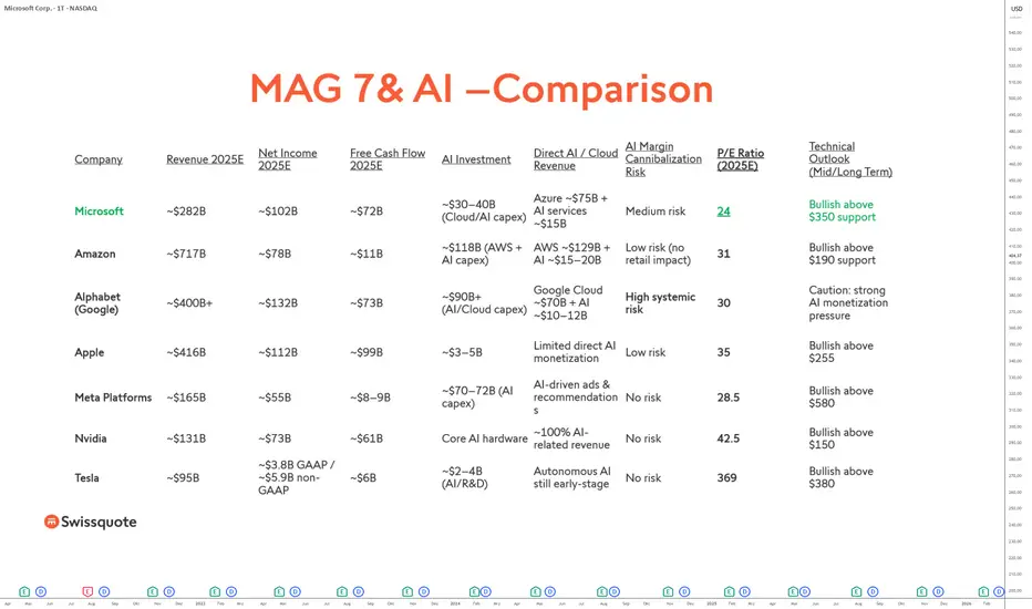 Im Vergleich zu den anderen Magnificent 7 weist Microsoft derzeit eine vernünftigere Bewertung als Nvidia oder Tesla auf und bietet zugleich eine bessere Cashflow-Visibilität als Unternehmen wie Amazon. Diese Kombination aus finanzieller Stärke, technologischer Führungsposition und wieder attraktiver Bewertung unterstützt die Annahme einer schrittweisen DCA-Zone für langfristige Investoren.