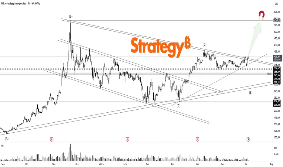 Strategy ist gerade dabei aus der im Chart dargestellten Struktur nach oben auszubrechen.