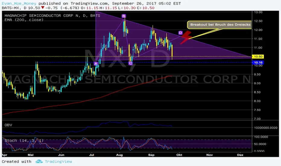 Magnachip Semicoductor bewegt sich in einem schönen Dreieck. Wir haben schon drei Abpraller gesehen, und ab dem vierten wird es in der Regel spannend. Das Dreieck ist zwar eine klassische Fortsetzungsformation, allerdings ist diese hier mit ein wenig Vorsicht zu genießen. Bei einem Blumenmarkt sollte die horizontale Linie des Dreiecks oben sein, und der Kurs immer wieder von dieser Abprallen, bis er irgendwann durchstößt. Hier haben wir also einen Bullenmarkt und ein bairisches Dreieck. Daher die Vorsicht mit diesem Signal!