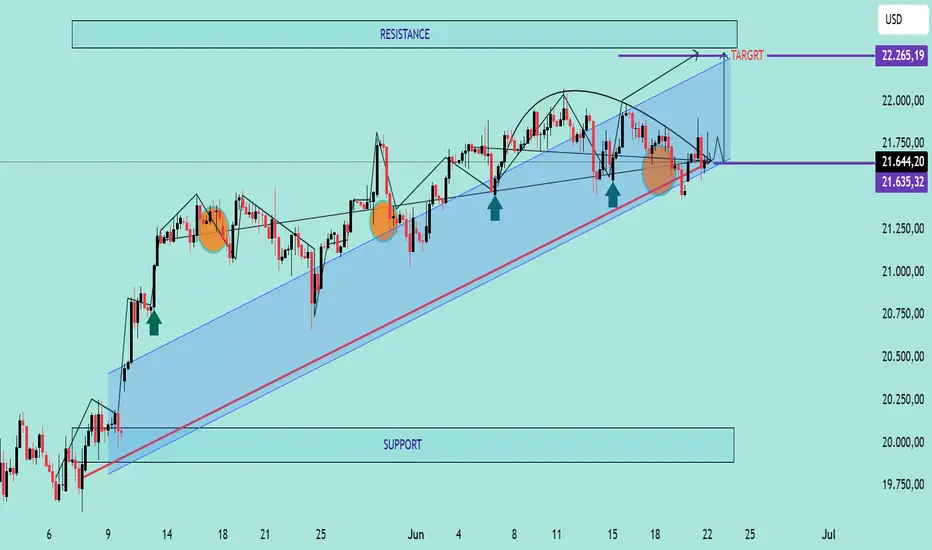 Unterstützung: Bereich um 21.635,32 – mehrfach getestet (gekennzeichnet mit 🔵 Pfeilen).