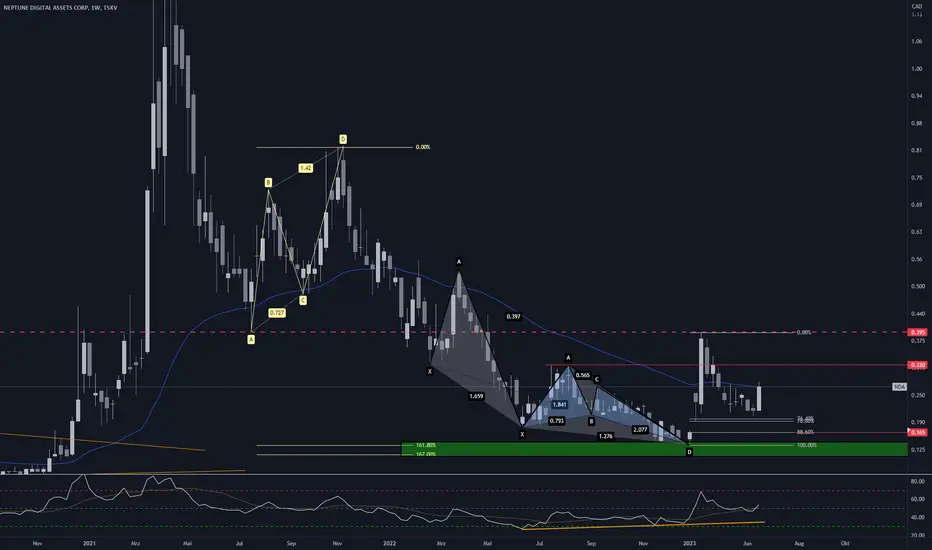 Nach dem Start der Abwärtswelle im April 2021 kam es zu einer Korrektur in Form eines ABCD-Musters. Der Rebound 127 des ABCDs wurde nun abgearbeitet. In der Zone des Rebounds wurden zwei weitere Muster ausgebildet – ein Black Swan und ein Butterfly. Das Butterfly hat seine Ziele bereits abgearbeitet, der BS damit immerhin auch schon seine konservativen Ziele. Mit den Harmonics im Bereich der Unterstützungszone (Rebound des ABCDs) könnte der Boden ausgebildet worden sein. Dafür spricht auch die Divergenz im RSI und der Impulsive Anstieg nach dem Test der Unterstützungszone mit dem auch das Hoch vom 18. Juli 2022 rausgenommen wurde.