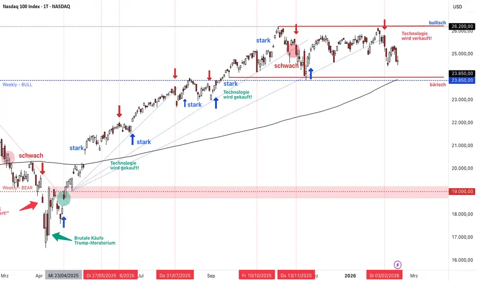 Die im April 2025 gestartete Aufwärtsdynamik flacht mehr und mehr ab. Zusammen mit den Intermarketindikatoren und der Saisonalität passen wir unsere Handelsmarken an. Damit wird die Nasdaq für uns "neutral". Im jetzigen Abwärtskurs ist die nächste wichtige Handelsmarke bei 23850 Punkten, unter der wir die Nasdaq dann auf bärisch setzen. Dann wäre auch höchste Vorsicht angesagt.