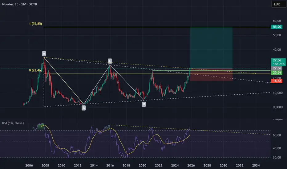 Die Aktie von Nordex ist mit der Oktoberkerze aus dem gezeigten Dreieck ausgebrochen. In dieser Woche gelang auch der erste Wochenschluss über dem letzten Mehrjahreshoch von 2021 bei 25,54€. Auch der RSI bestätigt diesen Ausbruch.