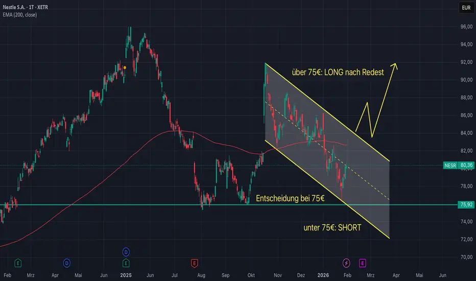 Der Chart zeigt einen klaren Abwärtstrend, der sauber in einem abwärtsgerichteten Kanal verläuft. Der Kurs handelt unter dem EMA 200, der als Widerstand wirkt, und auch unter der Kanal-Mittellinie – das spricht weiter für bearishe Kontrolle. Solange kein Ausbruch über den Kanal und über ~82–83 € erfolgt, ist die Trendfortsetzung nach unten wahrscheinlicher. Die wichtigste Unterstützung liegt bei ~75–76 €, wo ein technischer Bounce möglich ist und ggf. die Chance auf einen Trendwechsel.