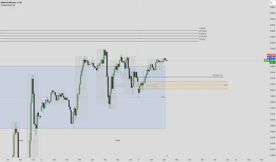 Nach dem der Nasdaq mit einem massiven NWOG am Montag eröffnet hat, gab es die Long-Reaktion nach oben auf den Levels von 2 H4 FVGs bis in das NWOG, was geschlossen wurde. Aktuell sehen wir unter dem Kurs das NDOG, den Schlusskurs des "Parkethandels" um 22:14:59 gestern. Über dem Kurs liegt ein H1 FVGs (siehe Levels 0, 0,25, 0,5, 0,75, 1)