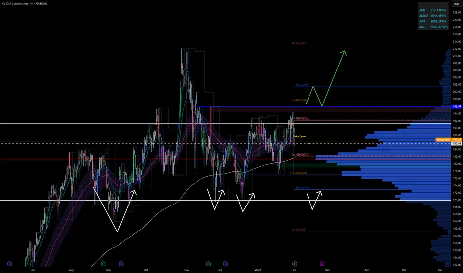 Nvidia bewegt sich seit August 2025 überwiegend seitwärts, trotz eines neuen All-Time-Highs bei 212 USD. Der Preis verbringt dabei die meiste Zeit innerhalb einer klar definierten Value Area zwischen ca. 170 USD und 191 USD. Zwar gab es vereinzelt Ausschläge über und unter diese Zone, strukturell bleibt der Markt jedoch rangegebunden.