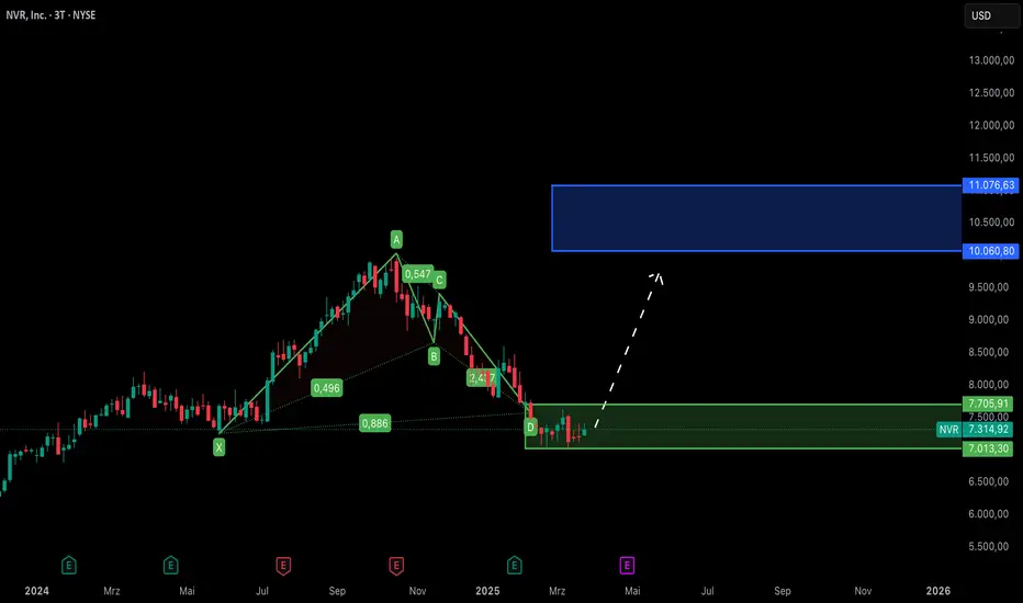 Ich steige bei NVR, Inc. ein, da sich das bullishe Bat-Pattern bereits vollständig gebildet hat. Jetzt heißt es, den Markt laufen lassen und abwarten. Die Bau-Branche könnte von sinkenden Zinsen profitieren, was die Nachfrage nach Neubauten weiter antreiben könnte .