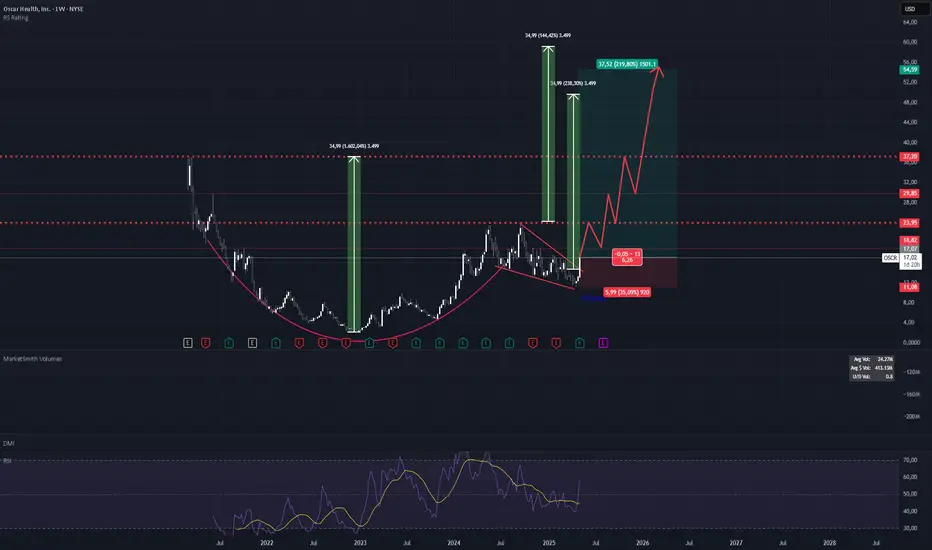 Falling Wedge: Die 50 %-Korrektur im Handle ist tief, aber akzeptabel für volatile Aktien wie OSCR. Die Wedge ist ein bullisches Muster, und der Ausbruch bestätigt die Stärke.