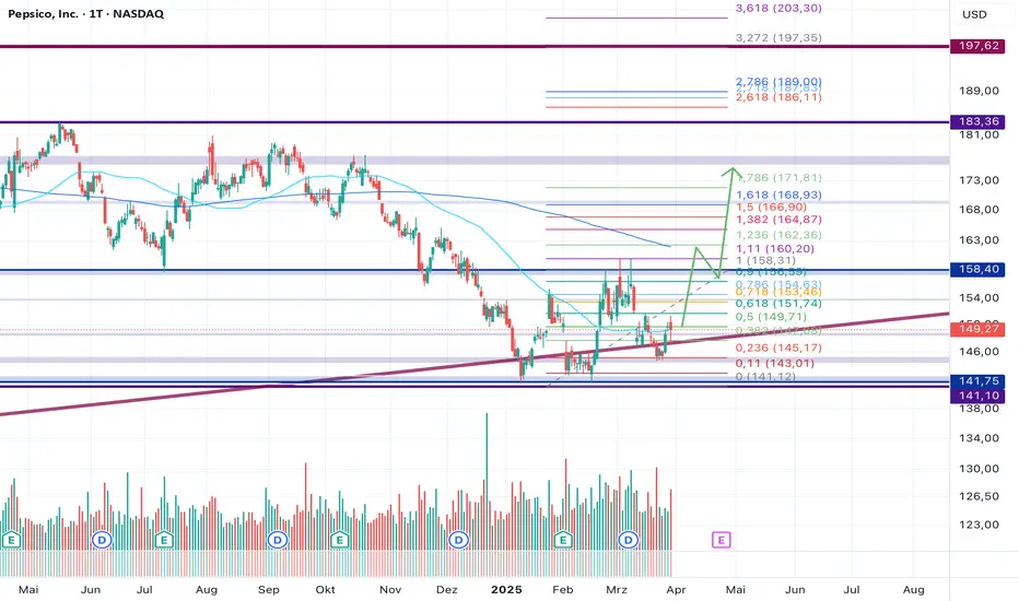 Kurzfristig befindet sich Pepsi in einem Abwärtstrend von 183,86 $ bis 141,10 $. Die 141-$-Zone wurde in den letzten Wochen mehrfach getestet, aber nicht durchbrochen. Besonders am 18. Februar kam starke Kaufkraft in den Markt, bevor die Aktie erneut korrigierte. Die letzte Wochenkerze zeigt eine potenzielle Umkehr an einer wichtigen Unterstützungszone.