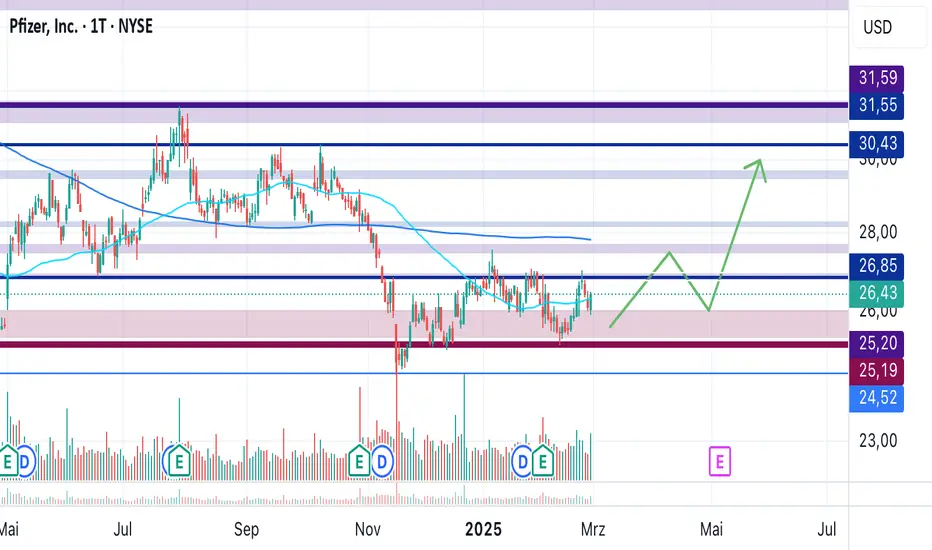 Die Pfizer-Aktie befindet sich weiterhin in einem übergeordneten Abwärtstrend, der sich von 61,60 USD bis 25,19 USD erstreckt.
