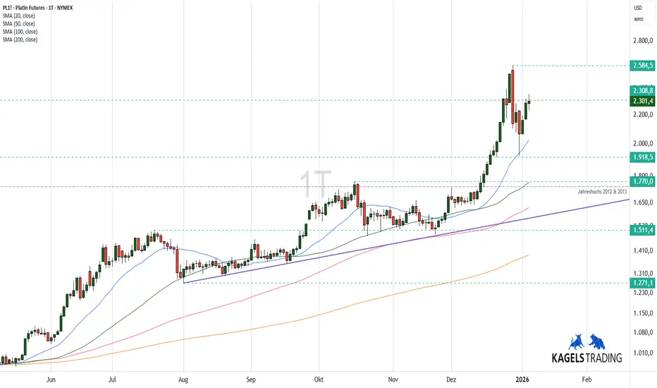 Platin notiert aktuell bei $2.303, nachdem der Kurs vom Ausbruch über das Jahreshoch aus 2008 zurückgekommen ist. Damit bildet der Bereich zwischen $1.730 und $1.770 eine wichtige Unterstützungszone.