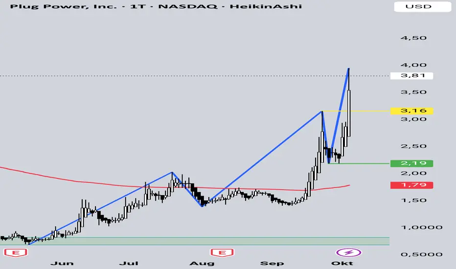 Plug Power in der Trendfolge. Altes Hoch gelbe Linie Kauf und grüne Linie neues Tief SL.