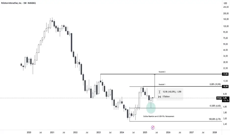 Sieht man sich die Peloton Aktien im langfristigen Monatschart an fällt auf, dass es im letzten Monat eine schöne Preisreaktion am 61.80% Fib. Retracement gab. Von dort aus konnte der Preis weiter ansteigen. Sollten die zwei Kursziele auf der Oberseite (Strukturhochs) erreicht werden, könnte sich hier ein unglaubliches Kurspotential von 160% ergeben. Da wir uns im Monatschart befinden ist hier Geduld gefragt. Es könnte eine Weile dauern bis diese Marken erreicht werden.