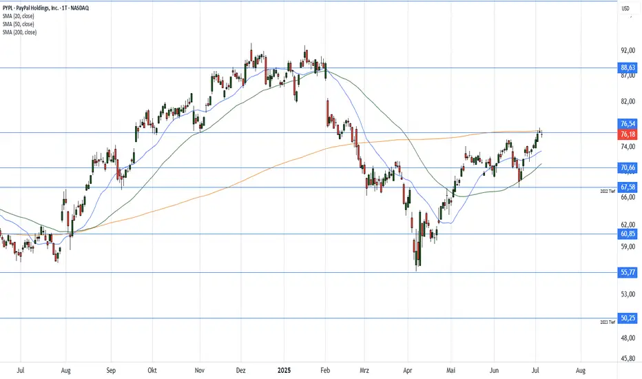 Rückblick: Der abgebildete Tageschart (logarithmische Skalierung) zeigt die Kursentwicklung der Paypal Aktie (PYPL) seit Mitte 2024. Die Erholungsphase des vergangenen Jahres ist Anfang 2025 in eine Korrektur übergegangen, die im $55er-Bereich auf Unterstützung für eine Gegenbewegung getroffen ist. Momentan ringt der Kurs um die 200-Tage-Linie.