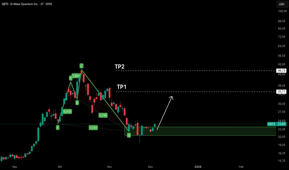 Auf dem Tageschart sieht QBTS aktuell sehr spannend aus. Ich beobachte generell Quantum Stocks sehr aufmerksam. Technisch hat sich ein bullishes Shark to 5.0 Pattern gebildet. Das erste mögliche Preisziel liegt bei etwa 34 $, und sollte der Kurs darüber ausbrechen, könnte charttechnisch sogar ein zweites Ziel (TP2) in Reichweite kommen.