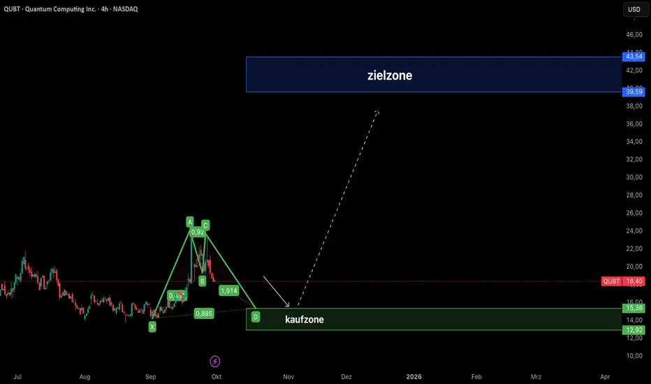 Auf dem 4-Stunden-Chart könnte sich bei QUBT ein bullishes Bat Pattern bilden. Besonders spannend: wir haben eine grün markierte Kaufzone, die als potenzieller Support dienen könnte.