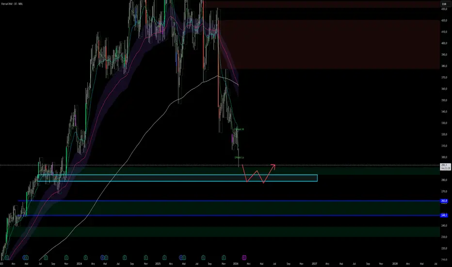 Ferrari befindet sich aktuell in einer Abwärtsbewegung und sollte sich aus langfristiger Sicht zunächst stabilisieren. Eine zentrale Zone liegt dabei im Bereich zwischen ca. 279 und 284 EUR, in der der Preis idealerweise Support finden und in eine ruhigere Akkumulationsphase übergehen könnte. Von dort aus wäre anschließend eine erneute Orientierung nach oben denkbar.