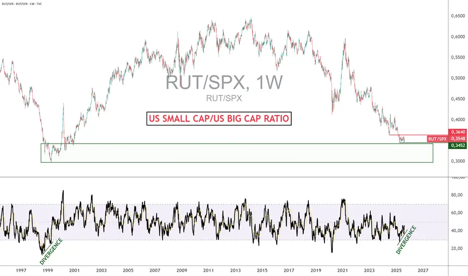 2) Das Verhältnis Russell 2000/S&P 500 ist ein wichtiges Barometer für die Risikobereitschaft an der Börse und wird nur dann und nur dort einen Aufwärtssprung machen, wo die FED im letzten Quartal 2025 einen echten Pivot macht