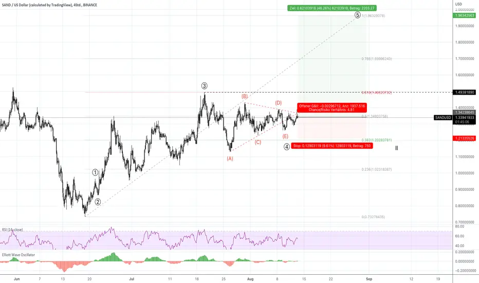 Chart technisch lässt sich ein sehr ähnliches Bild bei vielen Krypto-Assets erkennen, siehe Elliott Aufschlüsslung im Chart, wir befinden uns im Impuls der 5ten Welle.