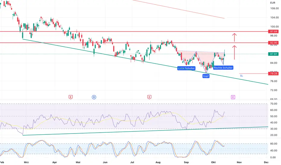 Bei SAP im Daily hat sich gestern eine inverse Schulter-Kopf-Schulter Formation gebildet. Beide Ziele sind im Chart markiert. Interessant ist zudem auch die RSI-Divergenz. Aber Achtung, wenn der Dax doch noch mal ein neues Jahrestief machen sollte, dann wäre der Entry noch etwas abzuwarten.