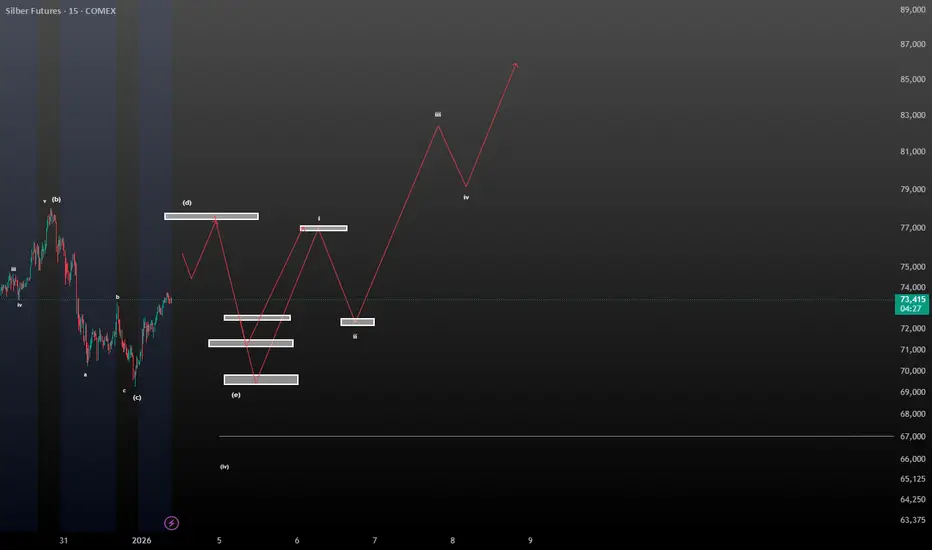 Kurzfristiges Ziel um 77 USD (Bruchzone aus dem Dreieck), weiterer Aufwärtsanstieg möglich, abhängig von der Fortführung der Impulsstruktur (I, III, IV, V).