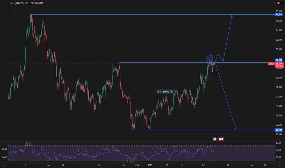 Richtung 10 Jahres-Hoch bei ca. 34,80USD oder wird Silber wieder abverkauft und läuft zum Widerstand vom Jahresbeginn bei ca. 28,80USD.