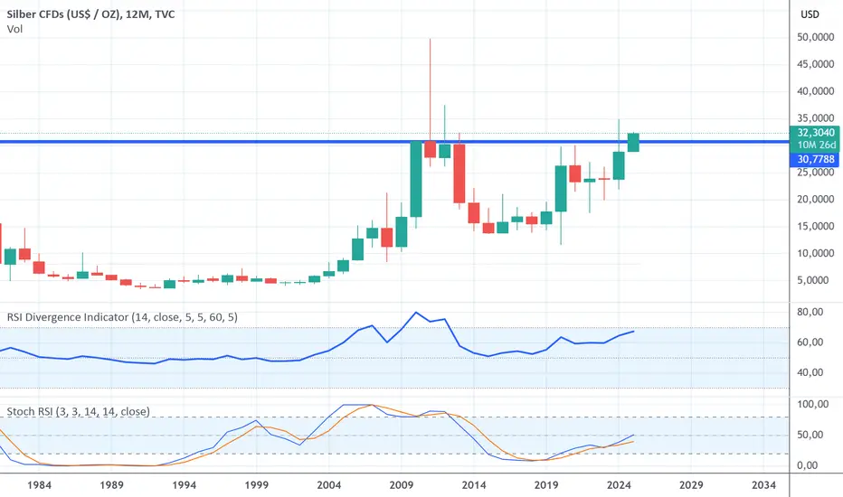 Die 4- jährige Widerstandslinie 2010-14 von Silber steht kurz vor dem Durchbruch ein grosse Bewegung 2025 halte ich für wahrscheinlich, die Aufholbewegung gegenüber Gold könnte Silver meines Erachtens über 50$ katapultieren!