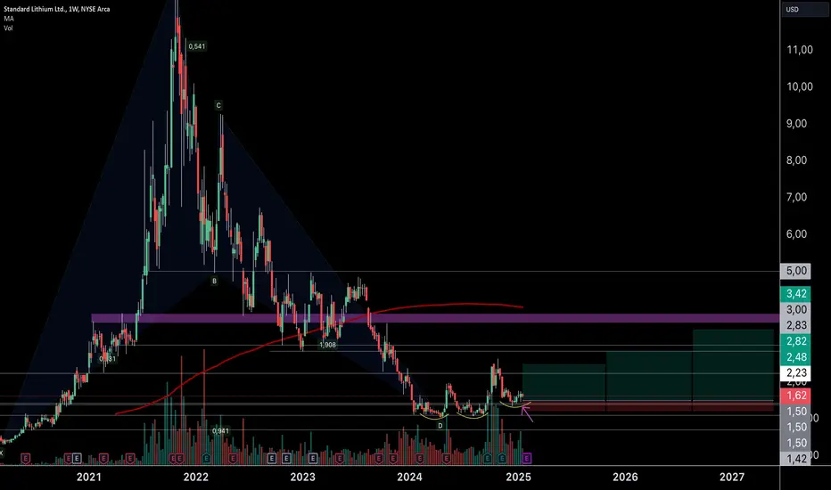Zum Einstieg skaliere ich zwischen 1,55$ -1,40$ in drei Tranchen mit je 33% meines Risikos hinein. Der Stop Loss liegt bei 1,22$, was ein 3,5 CRV zum ersten Take Profit Level bei 2,49$ ermöglicht (0.886er Fibonacci des letzen Swing Hochs).