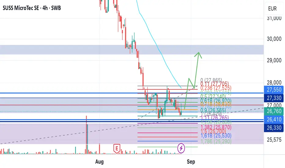 Im 4-Stunden-Chart hat die Aktie den Abwärtstrend zunächst gebrochen und ein erstes höheres Hoch gebildet. Momentan korrigiert sie diesen Anstieg und ist genau am 0,9er Fibonacci angekommen. Sollte der Markt kein neues Tief mit Schlusskurs unter 26,41 € machen und das höhere Hoch erneut brechen, könnte sich hier auf den kleinen Zeiteinheiten ein Aufwärtstrend etablieren.