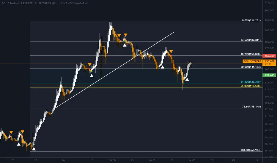 Nachdem wir einen starken Anstieg bei Solana mitnehmen konnten, haben wir nach dem Durchbrechen der Trendlinie (weiss eingezeichnet) dazu entschieden Gewinne mitzunehmen und sind mit einem grösseren Teil unserer Solana Position wieder in #USDT.