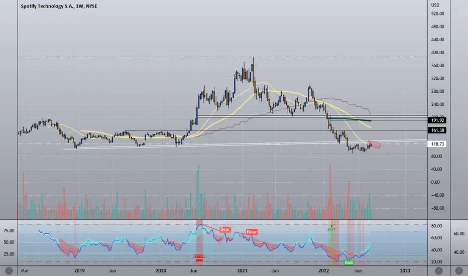 Auch Spotify mit mehreren Kaufsignalen, jedoch würde ich im aktuellen Markt und so nah am Widerstand, ein "starkbleiben" und ein "rumkauen" des Widerstands in Form einer konsolidierenden Bullenflagge bevorzugen, bevor ich hier meinen Einstieg finde. Dann jedoch wären aus meiner Sicht die beiden eingezeichneten Zielzonen relevant