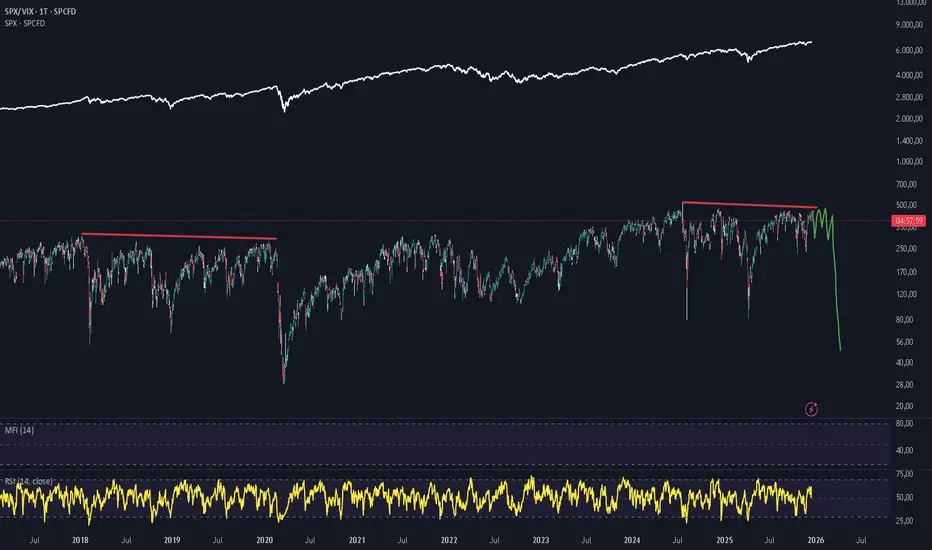 Den Chart hatte ich schon mal gezeigt. Es ist der SP500 geteilt durch den VIX.