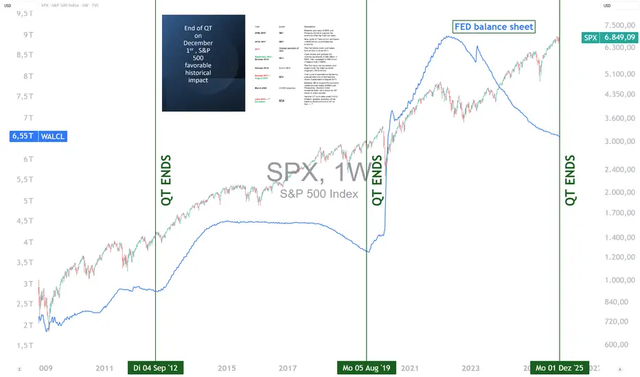 Die US-Notenbank (Fed) dürfte ihr Programm der quantitativen Straffung (QT) am 1. Dezember 2025 beenden. Dieser Schritt markiert das Ende der Bilanzreduzierung nach mehreren Jahren, in denen Liquidität aus dem Finanzsystem abgezogen wurde, um die Post-COVID-Inflation zu bekämpfen. Historisch fiel das Ende eines QT-Zyklus häufig mit einer Verbesserung des Trends des S&P 500 zusammen. Dennoch verdient dieses grundsätzlich positive Signal eine nuancierte Analyse, da der Index bereits auf historisch hohen Bewertungsniveaus notiert.