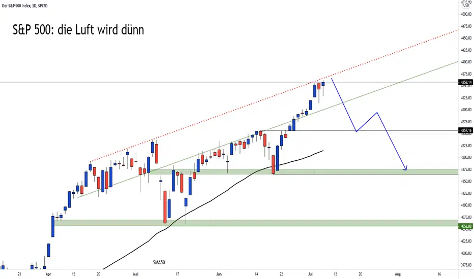 Der S&P 500 konnte seinen Kursschub in den vergangenen Tagen fortsetzen und in den anvisierten Zielbereich 4.350-4.400 Punkten vorstoßen. Am Mittwoch markierte er ein Allzeithoch bei 4.362 Punkten. Der Trend bleibt entsprechend in allen Zeitebenen klar bullish. Signifikante Intraday-Rücksetzer lockten in den letzten beiden Handelstagen sofort Schnäppchenjäger an, die die Notierung wieder in den Bereich der Tageshochs beförderten.