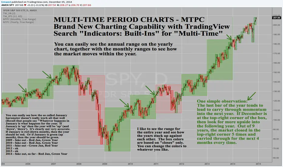 You can easily see the annual range on the yearly chart, together with the monthly ranges to see how the market moves within the year. I like to see the range for the entire year and see how the years stack up against each other. The box colors are based on "closes" only. You can change the colors to whatever you like.