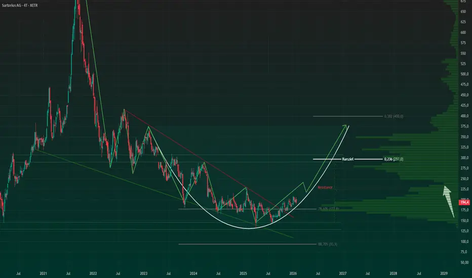 Im langfristigen Chart der Sartorius AG zeigt sich aktuell eine technisch sehr interessante Ausgangslage, die auf eine mögliche Trendwende nach einer langen Schwächephase hindeutet.