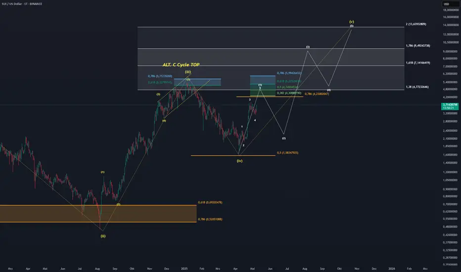 Es fehlt ein weiteres hoch für die letzte Bullishe Aufwärtsbewegung. Idealerweise baut diese SUI überhalb der 786 aus und hält einen Welle 2 retrace um sich auf den Weg zu machen.
