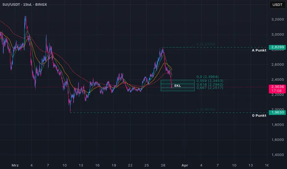 Ich habe jetzt SUI mal in den kleineren Time Frames aufgemacht. Aktuell stehen wir hier in einem EKL welches auch ein Trendwendebereich darstellt. Wir müssen dennoch beachten, das wir uns noch immer in einem Abwärtstrend befinden. Was muss passieren damit wir auch hier eine Trendwende bekommen können. Als erstes dürfen wir den 0 Punkt unter uns nicht mehr unterschreiten. Am besten wäre es, wenn wir in diesem Trendwendebereich noch etwas Konsolidieren und dann den Ausbruch über den A Punkt schaffen. Passiert das, haben wir eine kleine Bullische Struktur die aktiv ist. Wenn das geschehen ist, können wir die erste Zielzone der allen bestimmen und nach weitere Einstiegsmöglichkeiten suchen. Man kann jetzt Einstiege wagen, diese sollten allerdings mit dem gewissen Risiko Management versehen sein. Sollten wir aus dem EKL nach unten fallen, hätten wir noch zwei Marken wo man Einstiege wagen könnte. Dies wäre zum einen die Marke von 2.3964$ und dann noch 2.0653$.