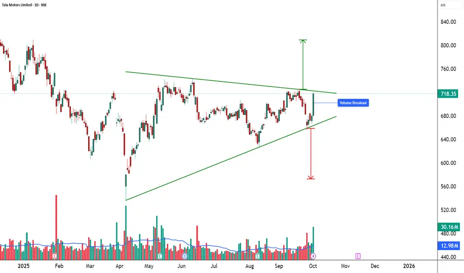 Tata Motors Ltd is one of India’s leading automobile manufacturers, producing cars, SUVs, electric vehicles, and commercial vehicles. After an extended consolidation phase, the stock is trading inside a symmetrical triangle formation, indicating a possible strong directional move ahead.