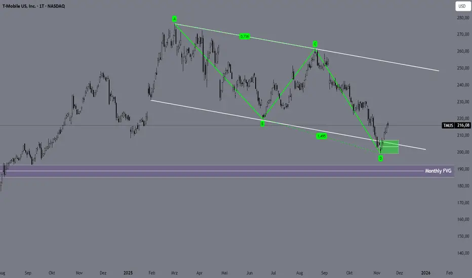 TMUS hat ein neues Low gebildet. Der Aktie fehlt aktuell einfach das Momentum. Interessant ist, dass wir mit einem weiteren internen ABCD-Pattern (Hellblau) und dem übergeordneten ABCD-Pattern (Grün) eine Clusterzone im Bereich des Weekly FVG bilden.