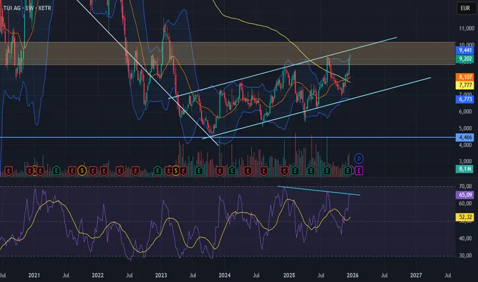 suche im gelben Bereich nach einen kleinen oder evtl. großen Swing short Trade. Je nach dem wie der Chart sich entwickelt. Wir sind zurzeit im Wochen RSI überkauft und bilden auch eine Divergenz (bearish). Gleichzeitig sind wir in einem aufsteigenden Kanal (bearish). Ist aber mit Vorsicht zu genießen, da der Kurs auch leicht einfach weiter ziehen kann.