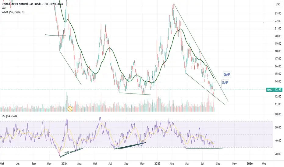 UNG zeigt jedes mal nach positiven Divergenzen im RSI eine Aufwärtsbewegegung, die teils heftig verlief. So auch kann man jetzt erwarten, d. die nächsten Tage / Wochen von steigenden Kursen geprägt sein wird.