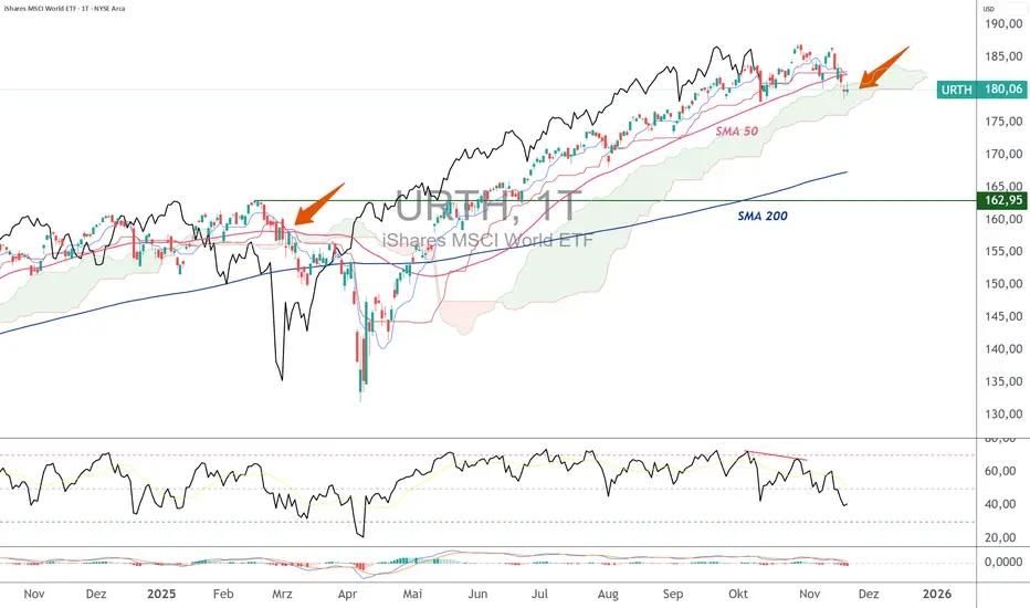 Aus technischer Sicht befindet sich der MSCI World derzeit an einem entscheidenden Wendepunkt. Der Tageschart zeigt eindeutig eine Schlüsselzone: Die Kurse testen gleichzeitig die tägliche Ichimoku-Wolke sowie den gleitenden 50-Tage-Durchschnitt (SMA 50), zwei wichtige Unterstützungen zur Aufrechterhaltung des mittelfristigen Aufwärtstrends. Historisch signalisiert ein Bruch der oberen Ichimoku-Wolke auf Tagesbasis häufig einen Trendwechsel oder eine verlängerte Korrekturphase.
